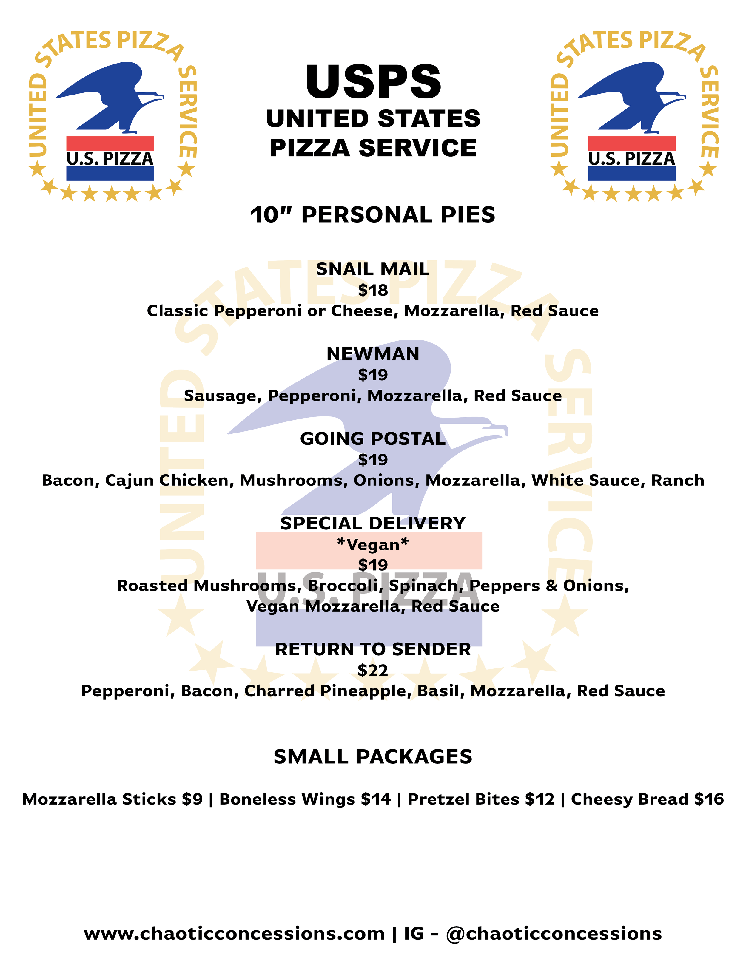 From the crew behind Chaotic Concessions comes USPS, United States Pizza Service — delivering first-class flavor, no postage required.